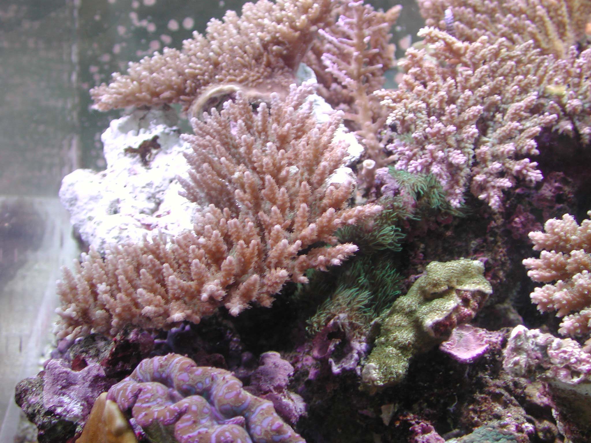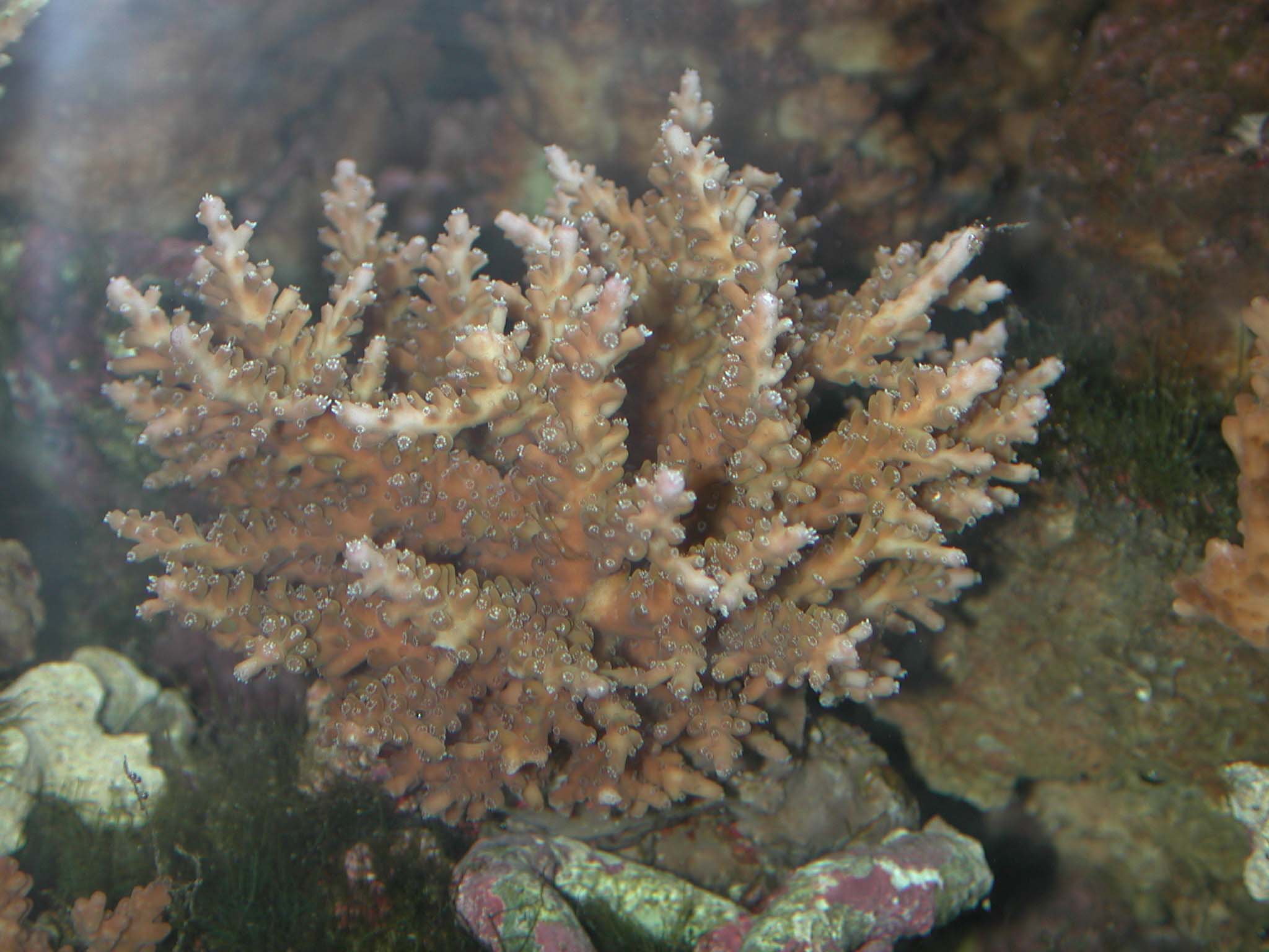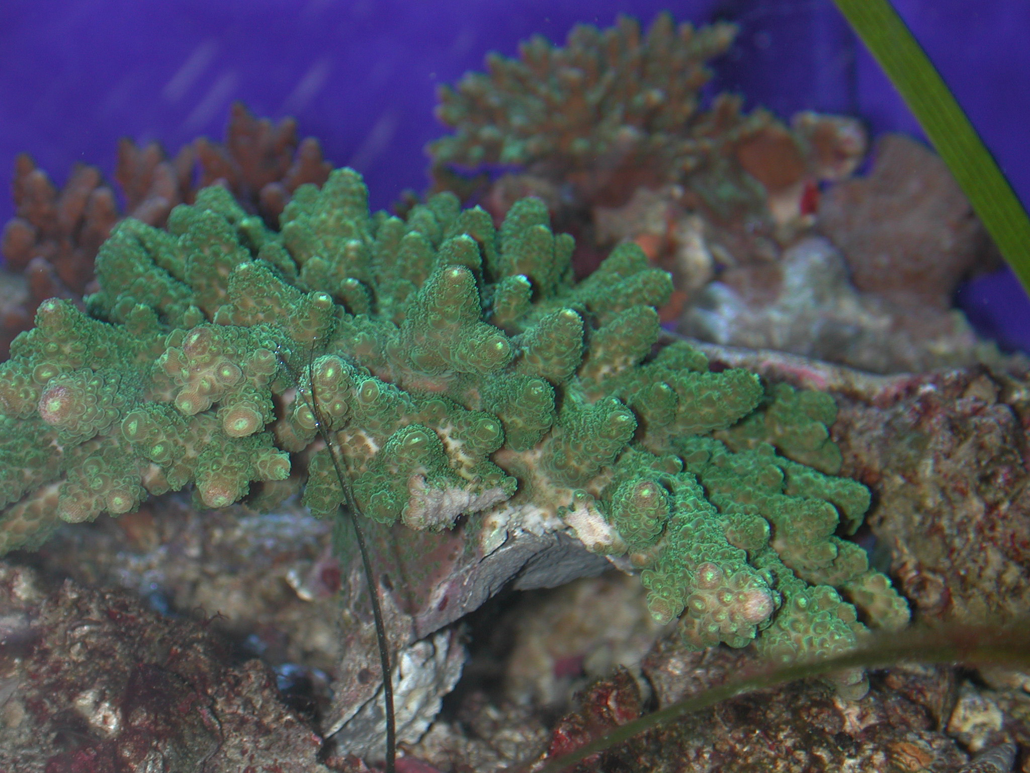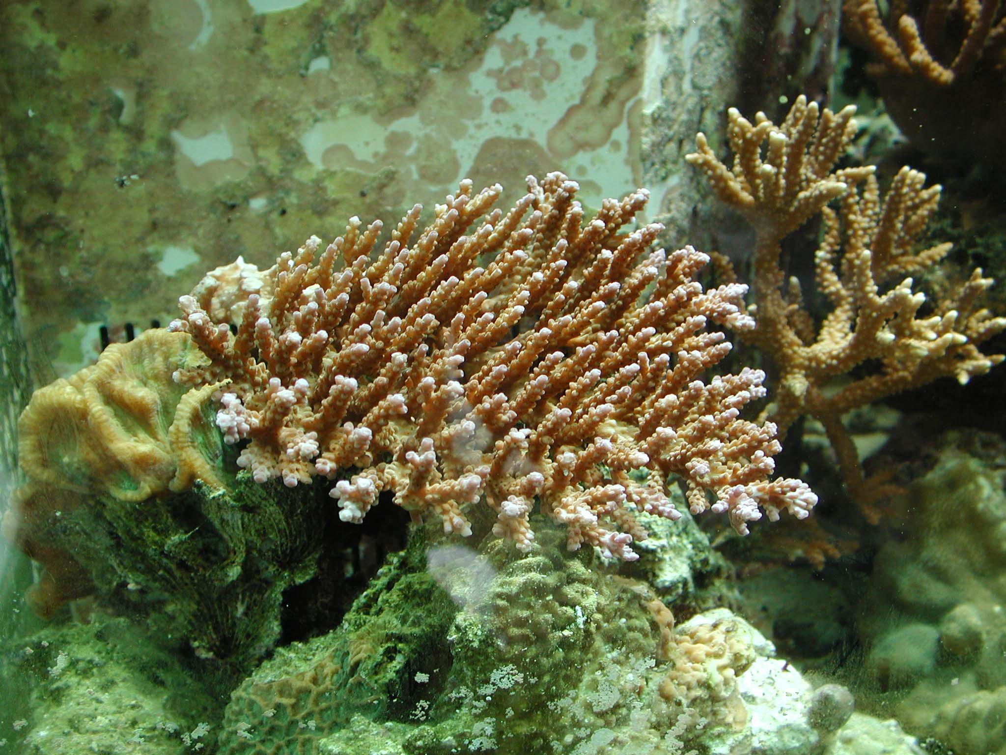 水槽の中のミドリイシの成長具合は著しいものがある。