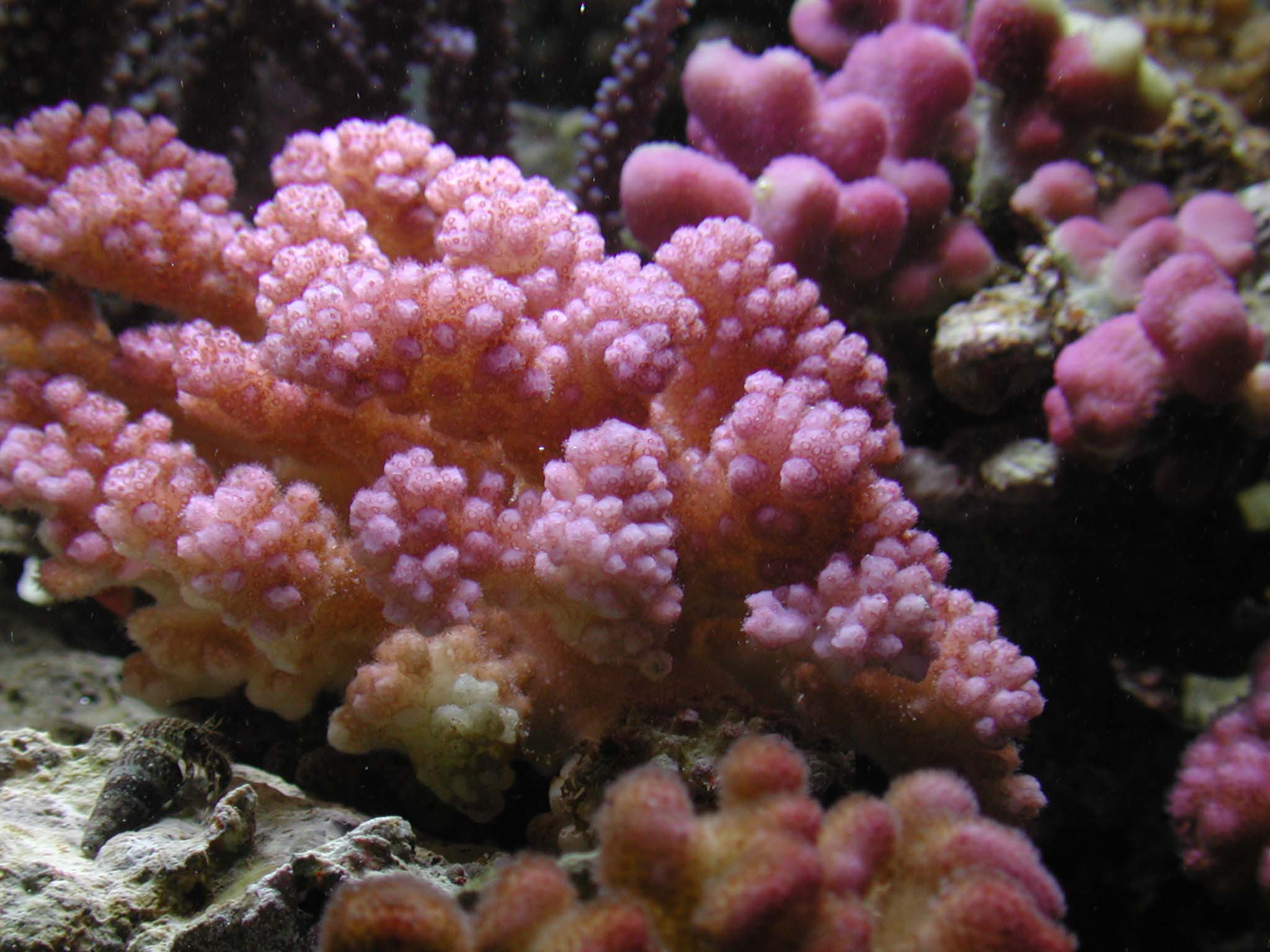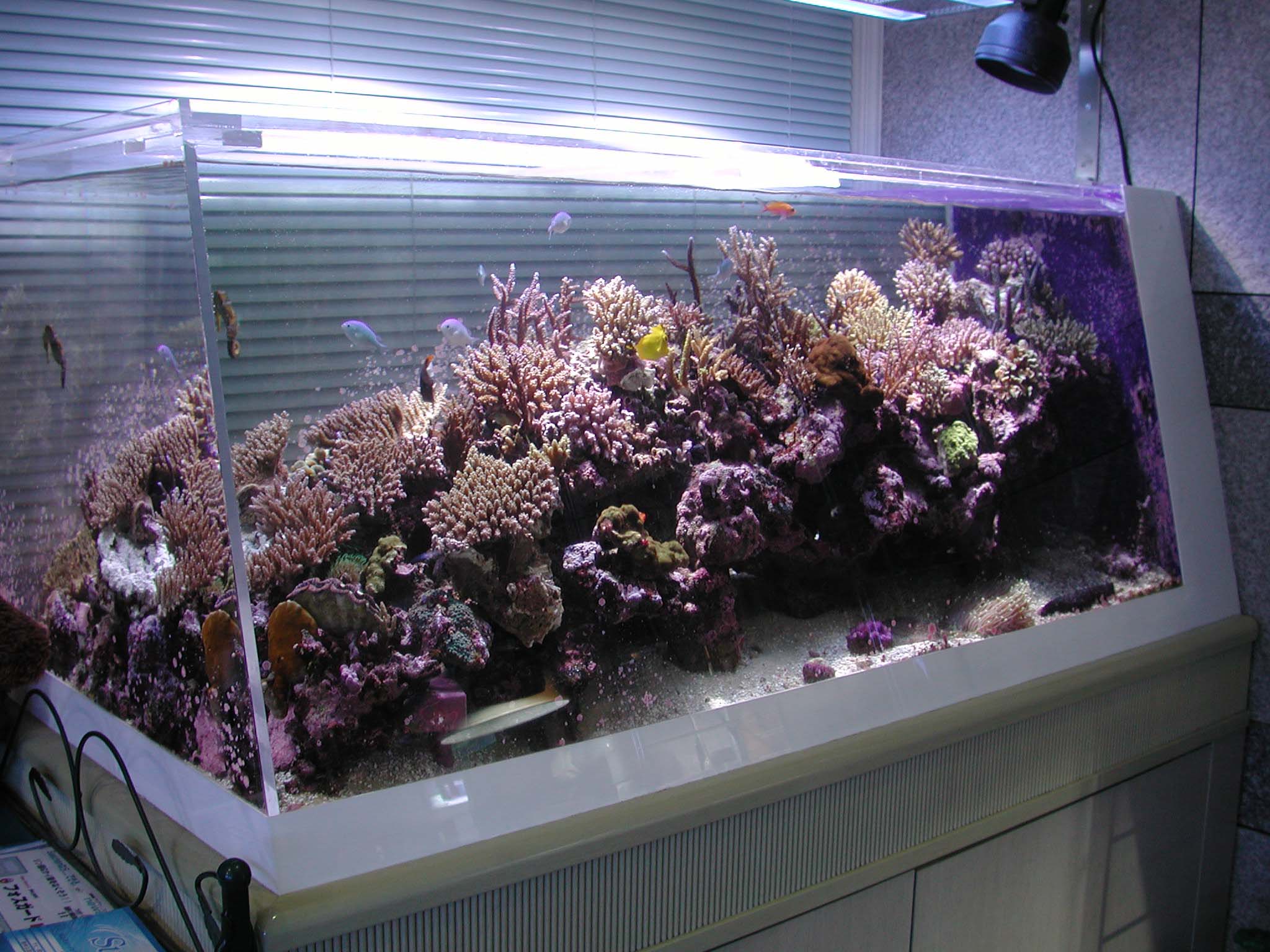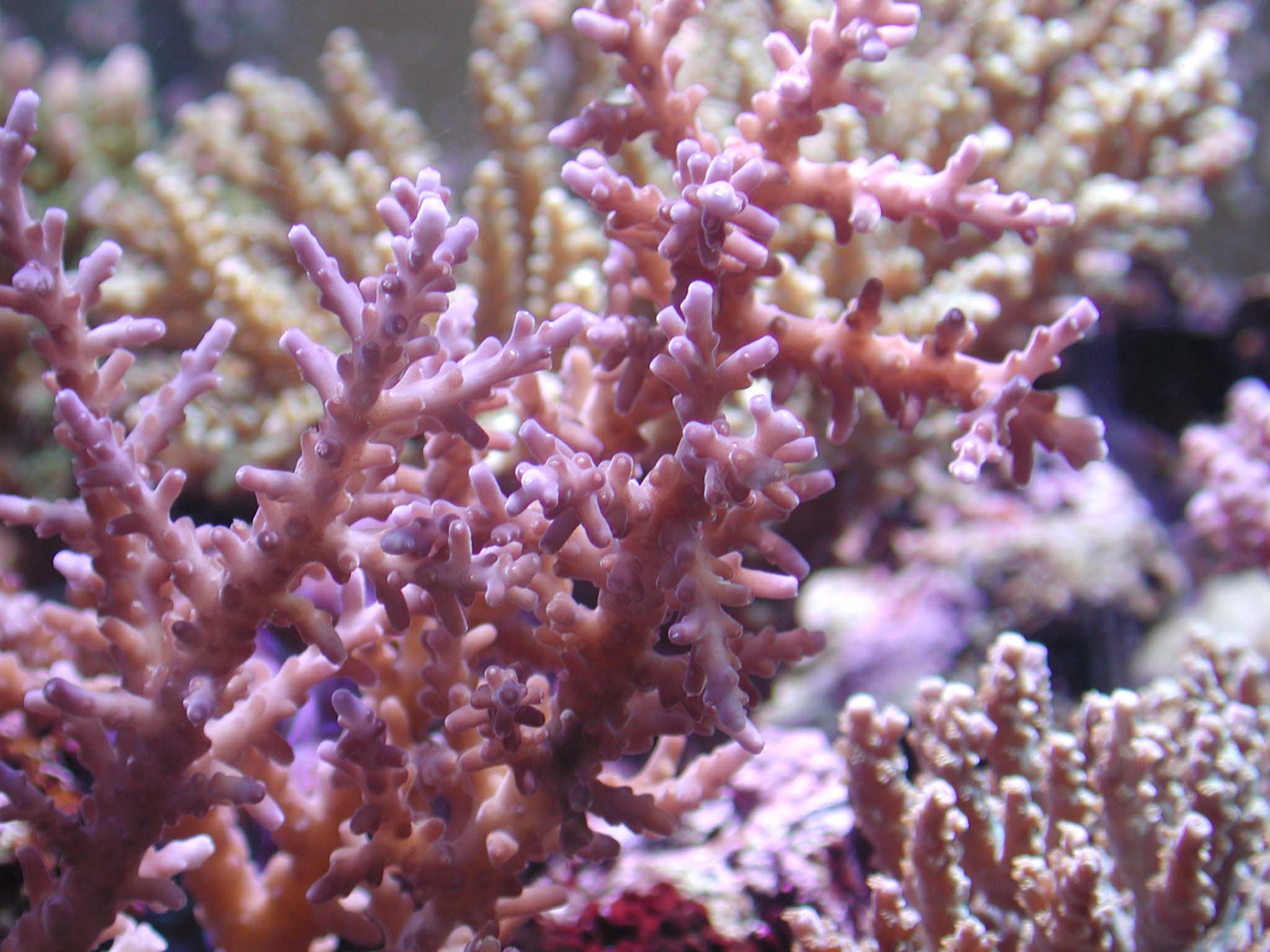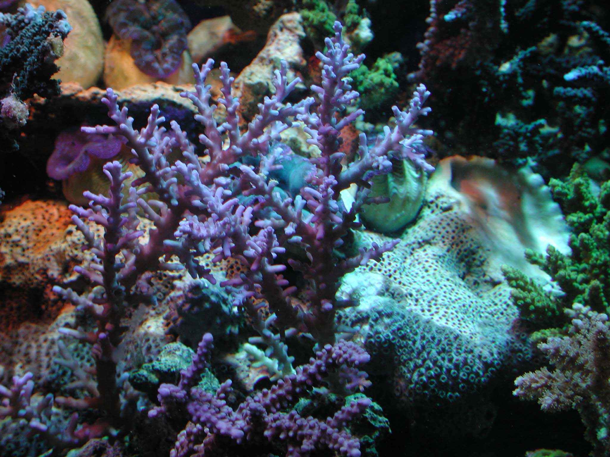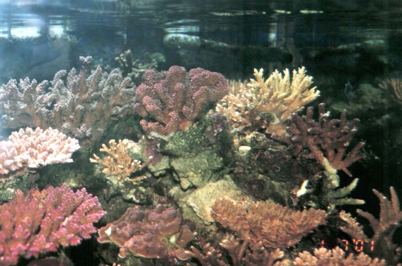 水槽の中のミドリイシの成長具合は著しいものがある。