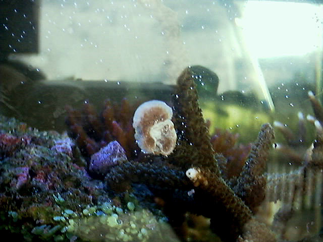 水槽の端っこにおいていたシカツノのミドリイシが成長して水槽のアクリク面にくっ付いていまっている。