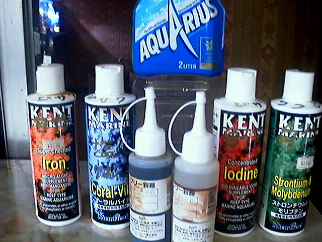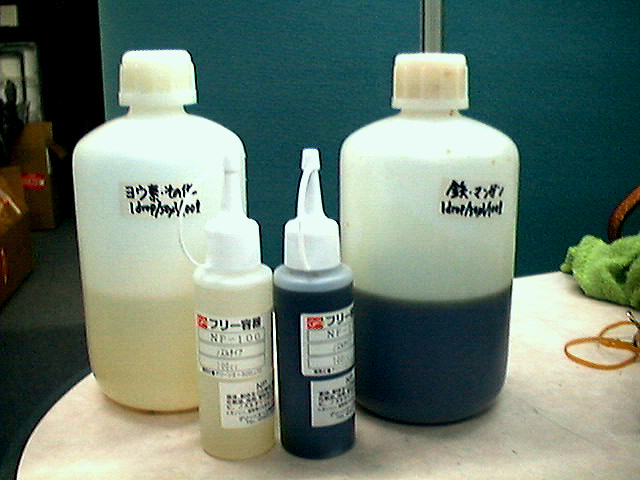 上野スペシャル!! 右側は鉄とマンガンそれを中性にしてある。 左側はヨー素を中心にその他約20種類の微量元素をブレンドしている。 手前のこびんは小分けしたもの。 100Lにつき1滴の計算で両方を毎日入れる。 |