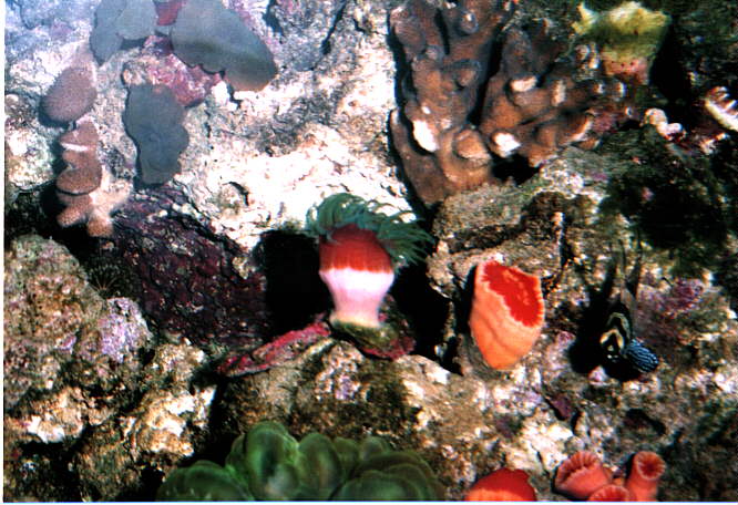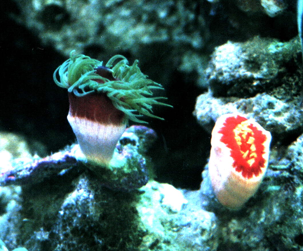 この映像は決して色付けしたものではありません。 餌はイカをやっていたそうです。 電気としては蛍光灯のブルーランプを付けていてメタハラは付けていないそうです。 右の普通のハナタテとくらべてもらえれば色の違いがわかると思います。 触手だけではなく全体的に薄緑色をしているように思います。