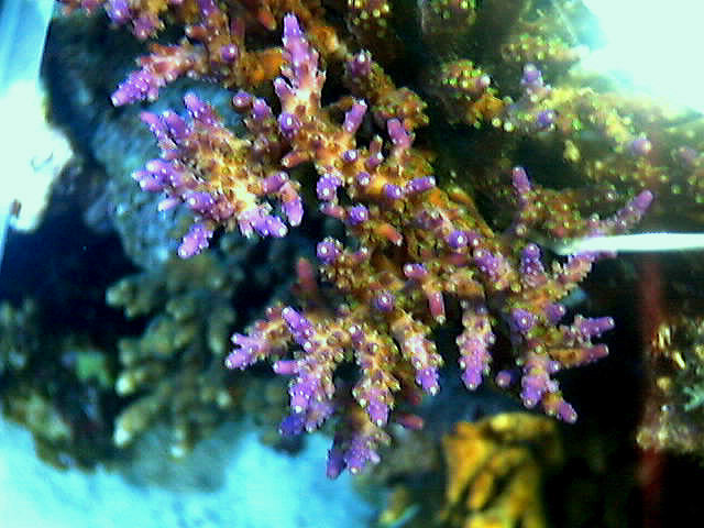 難しい | 難しいといってもミドリイシの中では一番簡単です。 高濃度の燐酸塩下では生息出来ません。 強い光が必要な為蛍光灯での飼育はほとんど不可能です。 少しの紫外線には抵抗力があるようです。 以下訂正 適当な紫外線があったほうが良い様です。 UVに関してはいくらが一番最適かと言う事は今まだ解かっていませんが1000μW/cu前後が今の所良いように思っています。(測る距離にもよるが) メタハラは10000Kや6500Kの方が良くコウラルグロー球の様な球では上手く先端がピンクや紫にはなりません。 赤色の波長が極端にすくないせいだとおもいます。 ある意見として球自体が赤色をの球を使うと赤くなると言う説が濃厚です。 特に一部分だけ照らす場合はミニマイト9Wとかが有効です。 赤色のところは成長しているところで褐虫藻が繁殖していないところと言う意見もある。 しかしこのピグメントはこのサンゴの健康状態を示しているものと思われますので注意が必要です。 光線量がすく無くなってくるとピクメントが出なくなってきますのでその時は注意がひつようです。 また光線を多量に毎日照射しつづけると褐虫藻が抜けてしまい色が全体的に薄くなってきます。 この時は全体的に色の変色がありますのでこの時の正常な状態に戻す必要があります。 また枝を折ってライブロックや死珊瑚の上に置くと良く定着する事があります。 昼間余りポリプを伸ばさないが緑色のポリプを少し出す事があるが毛むくじゃらにはならない。 またカルシュウム濃度を適当な濃度に保つ必要がある。 一度設置すると動かさない事が大切です。 水温としては25度付近が適しているようです。 定期的にカルシュウムとストロンチュウムの添加が必要です。 水流は適度にあったほうがいいが強烈な流れはいらないようだ。 6500kの光線を真近にあてるとこうなります。 写真とは違う個体ですが。 |