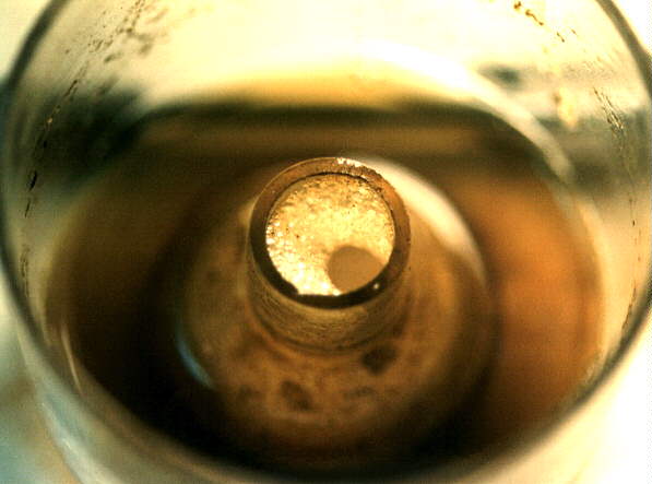 - プロテインスキマーの泡がたまったカップ 泡をとったところの写真です。これを見る限りではプロテインスキマーをつけて良かったと思う取れ具合です。